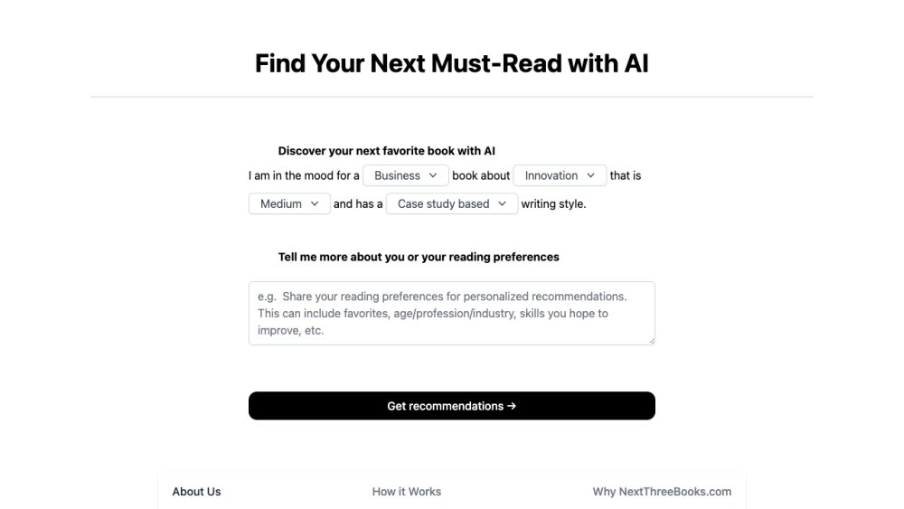 AI AssistantNextThreeBooks.com: NextThreeBooks.com is a book recommendation website that uses GPT-3 to provide personalized book suggestions to its users. It aims to simplify the process of choosing a book by offering tailored recommendations based on individual reading preferences. The website helps users discover their next favorite read by providing a curated selection of three books with detailed explanations.