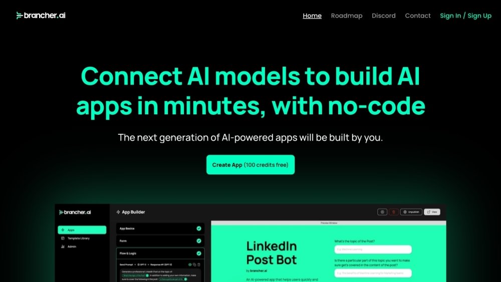 AI ModelsBrancher.ai: Brancher.ai is a no-code platform that allows users to connect AI models together to build unique AI-powered applications. It enables users to create, monetize, and share their AI creations with the world. The platform offers ready-made templates to boost creativity and productivity, making AI accessible to individuals without coding knowledge.