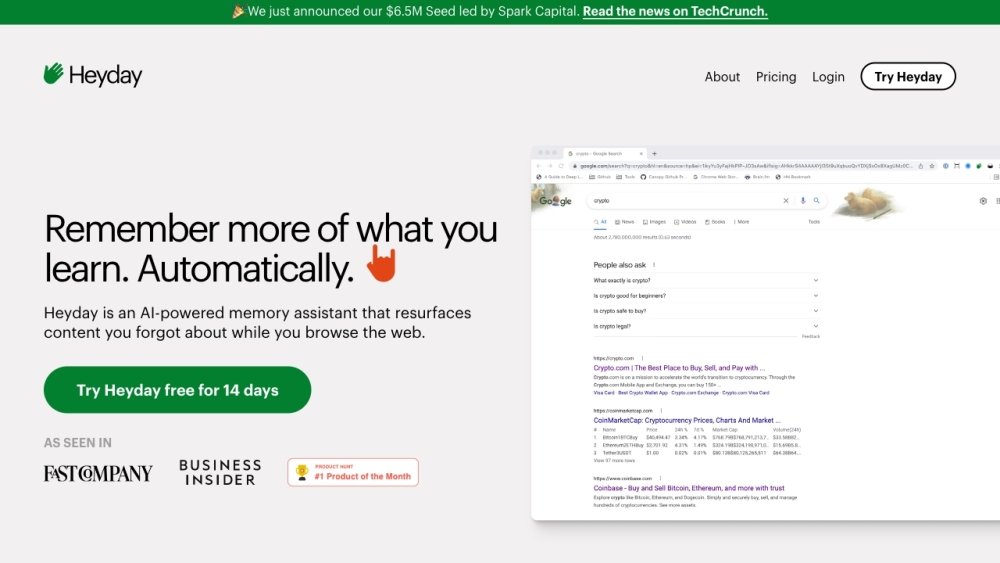 AI Knowledge BaseHeyday: Heyday is an AI-powered memory assistant that resurfaces content you forgot about while you browse the web. It automatically saves pages you visit and resurfaces them alongside search results, enhanced search results, article overlays, and a knowledge base that fills itself.