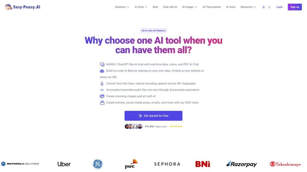 AI Writing AssistantsEasy-Peasy.AI: Easy-Peasy.AI is an all-in-one AI platform that provides a comprehensive suite of tools for content creation, image crafting, audio generation, and AI transcription. It offers over 200 templates to help users create articles, social media posts, emails, and more. The platform also includes AI-powered tools for image and art generation, audio transcription, text-to-speech conversion, and custom chatbot creation. Easy-Peasy.AI aims to simplify and accelerate the content creation process for individuals and businesses.
