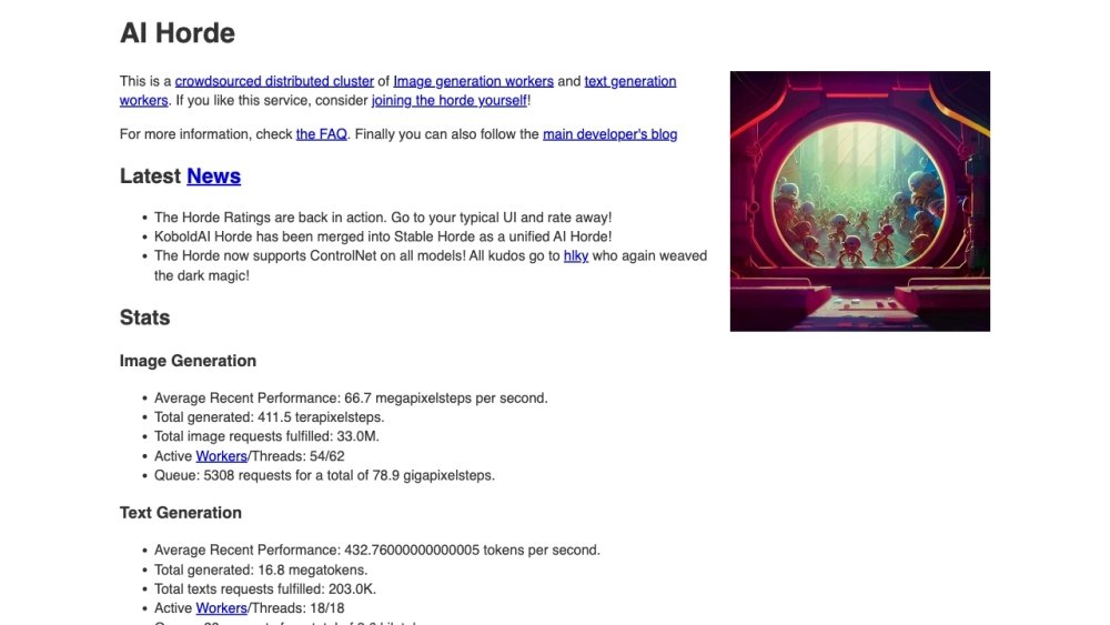 Text to ImageAI Horde: AI Horde is a crowdsourced distributed cluster of image generation workers and text generation workers. It provides a client interface requiring no installation and no technical expertise. Users can submit image and text generation requests, which are then processed by a network of volunteer workers contributing their computing resources. The platform also allows users to contribute their own GPUs to the horde to help generate images for others.