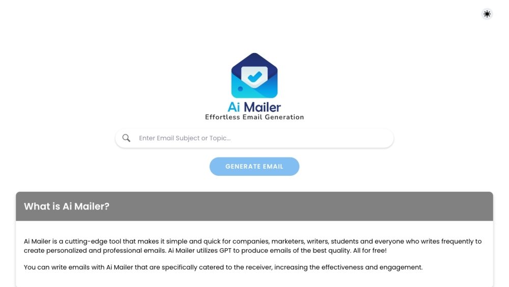 AI Email GeneratorAI Mailer: AI Mailer is a cutting-edge tool that uses GPT to produce high-quality emails. It simplifies and accelerates the creation of personalized and professional emails for businesses, marketers, writers, students, and anyone who writes emails frequently. It leverages AI to automate email writing, generate content, compose emails, and personalize messages, all for free.