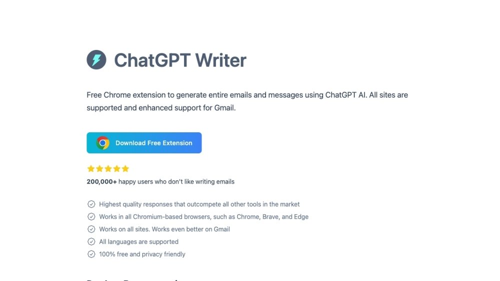 AI Writing AssistantsChatGPT Writer: ChatGPT Writer is a free Chrome extension that uses ChatGPT AI to generate emails or replies based on a few keywords. It supports Gmail and all popular languages. Powered by GPT-4.1, Claude, and Gemini, it allows users to write emails, correct grammar, translate, research, and more on any site. It also offers advanced Gmail and LinkedIn integration, switchable AI models, writing tone control, response length options, and prompt templates.