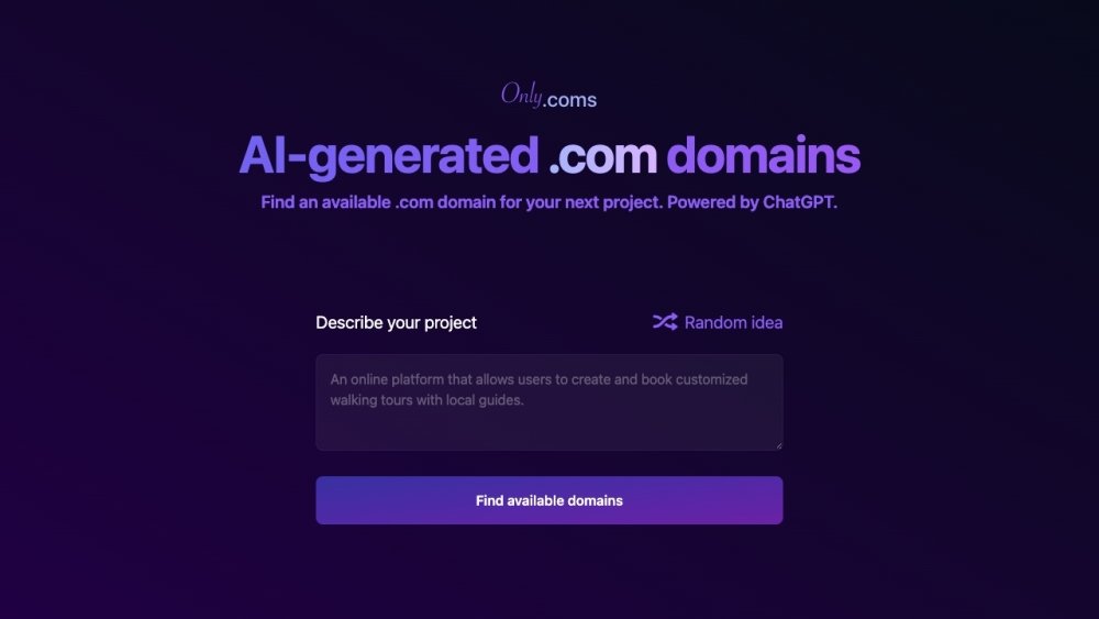 Large Language Models (LLMs)OnlyComs: OnlyComs is an AI-powered platform designed to help users find available .com domain names for their projects. By providing a short description of the project, the platform generates a list of available .com domains using GPT technology.