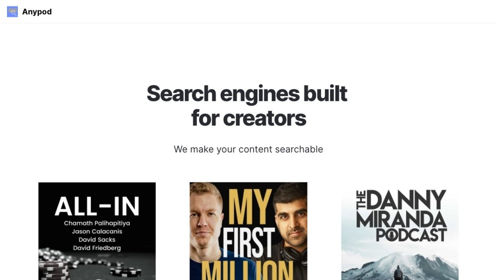 Anypod: Anypod is an AI search engine built for creators that allows users to search through their favorite podcasts easily, like My First Million. It also allows users to submit a form to add their podcast to the search engine. Anypod is a website made with Typedream.